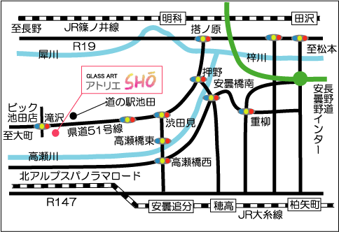 ●長野道 安曇野インターより北アルプスパノラマ道路から51号線大町・白馬方面へ約20分 ●長野道安曇野インターより国道19号から県道51号大町明科線を大町・白馬方面へ約20分 |